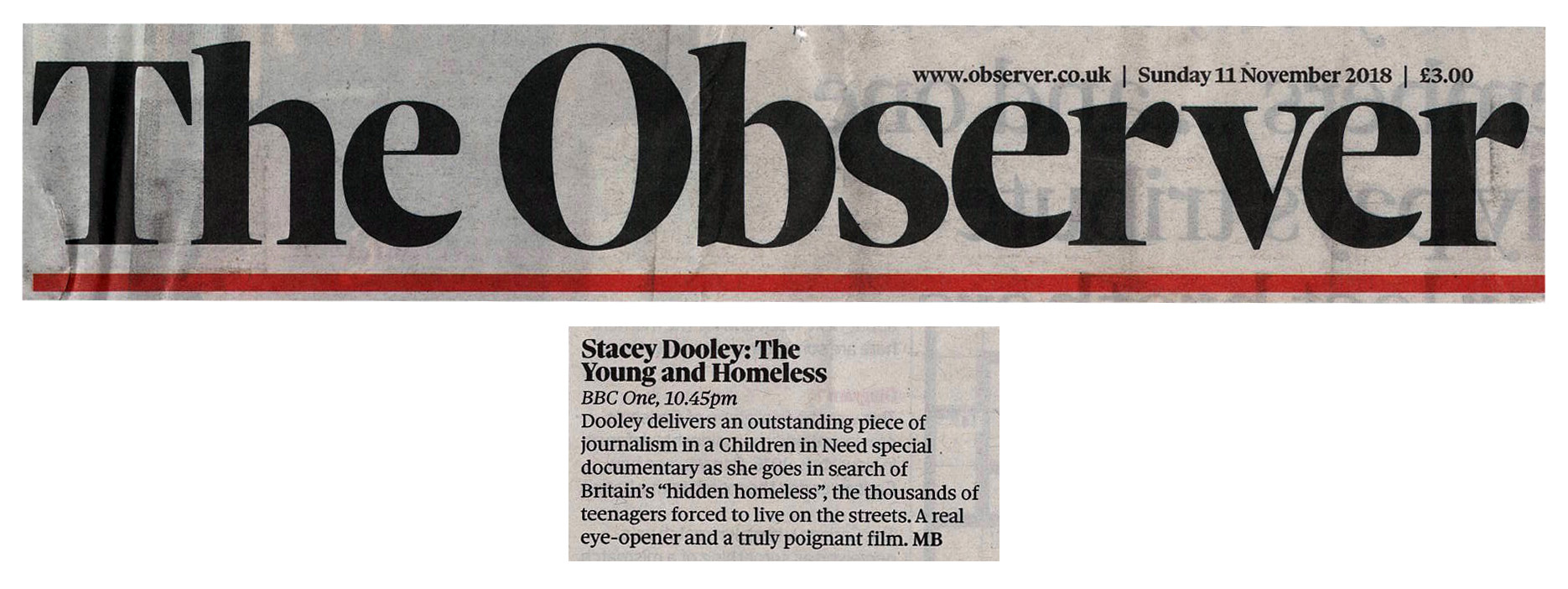 "Dooley continues to prove why she’s one of Britain’s most astute documentary makers, with a moving account of life for the UK’s hidden homeless"Lucy Mangan - The Guardian